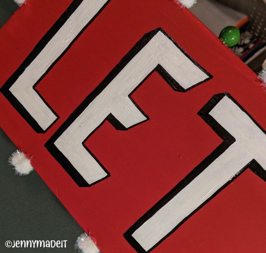It took two coats, even though I could’ve gotten away with one. Next, it was time to use the black paint pen (Sharpie brand) and outline each letter as well as add the drop shadow. This part made me kind of nervous because paint pens generally have oil-based paint in them and I knew a boo-boo could cause a big problem for me.