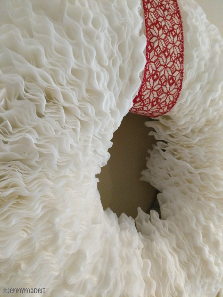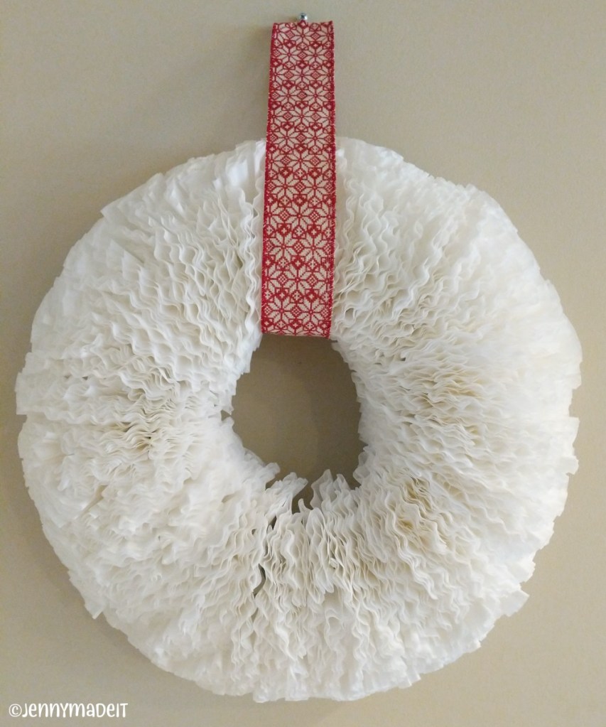 I found a few different tutorials online and only needed to glance at those to determine how I was going to make this. I purchased a foam wreath form, using a coupon from Joann’s, and I purchased 300 white coffee filters from the grocery store. I have a lot of glue sticks for my gun. I had this about half done last month and got bored (typical me) but today I decided it’s getting done! And it did. And I love it!! The neat thing about this wreath is that it can be used all year round. It’s easy to use a different hanging ribbon. Some people have dyed their coffee filters first, but I was in the mood for a stark wreath.