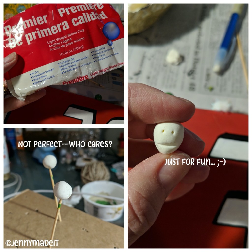 When all my beads were nice and green and had two coats of glossy Mod Podge on them, I knew I could start gluing them and the pom-poms to the edge of the board. I want to note here that I’m totally aware that these beads can easily pop off since hot glue isn’t as strong as maybe an E-6000 or superglue, but since the sign is for my house, and I know I have to carefully store it in the off-season, I was willing to take that risk. However, I laid my beads and pom-poms out a little differently and went too fast, gluing all the pom-poms on, when I realized I was short two beads. And I looked and had no more of that size. That’s when my air-dry clay came to the rescue!