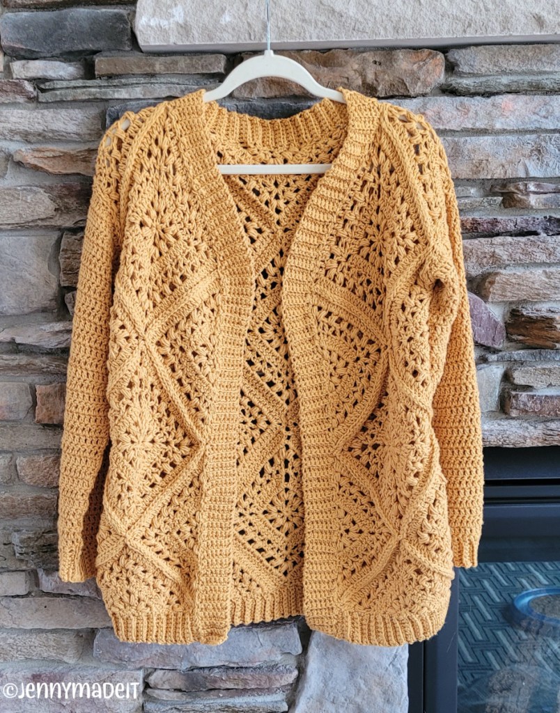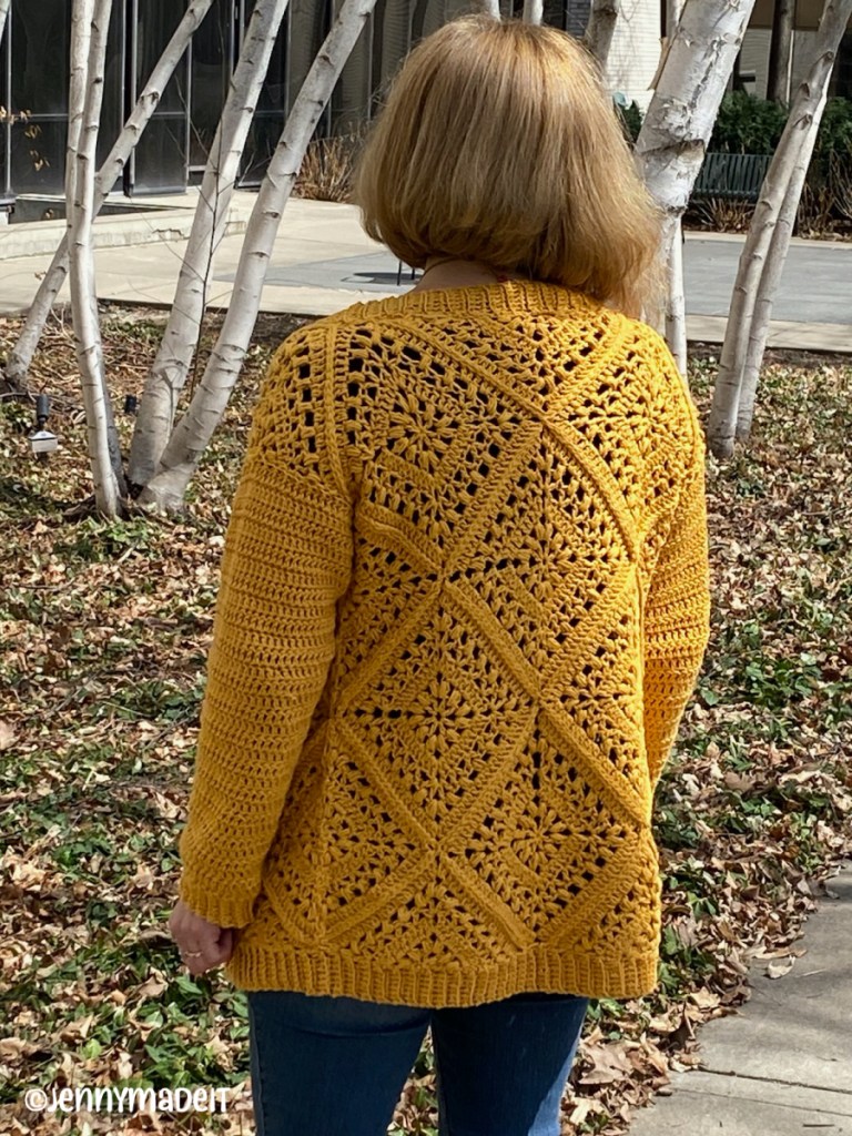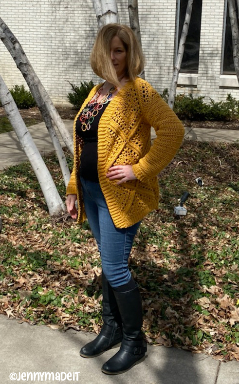 So I am on Instagram a lot. You can find me at jenthestitchingfren. And that’s where I saw a video post by Wilma of Wilmade. Her post showcased her Tulip Square Cardi and it looked so easy! I saved the post thinking, someday I might make this. And then literally 24 hours later, I had purchased the yarn for the project and got started. This cardigan was quite simple and fast to make. I had to do it. I believe within one week I had completed the cardigan and I have since worn it. It feels so comfy to wear. If you’re in the market for a simple yet beautiful cardigan that you can crochet, definitely go to Wilma’s site or find her on Ravelry and purchase the pattern. It’s an affordable pattern and supports a young crochet designer whom I am happy to support!