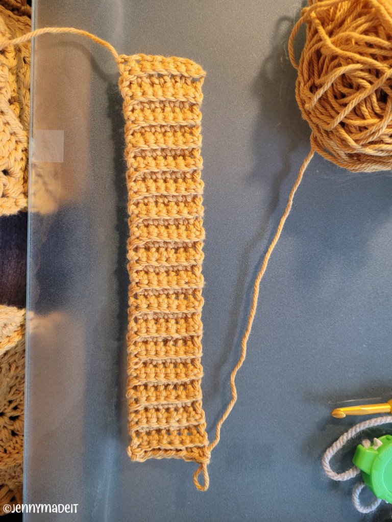 If you’ve never crocheted a garment before, you might wonder how the ribbing along the bottom and the cuffs of the sleeves are done. The ribbing is crocheted separately and whipstitched onto the pieced squares and triangles. Easy to do and fast as well.