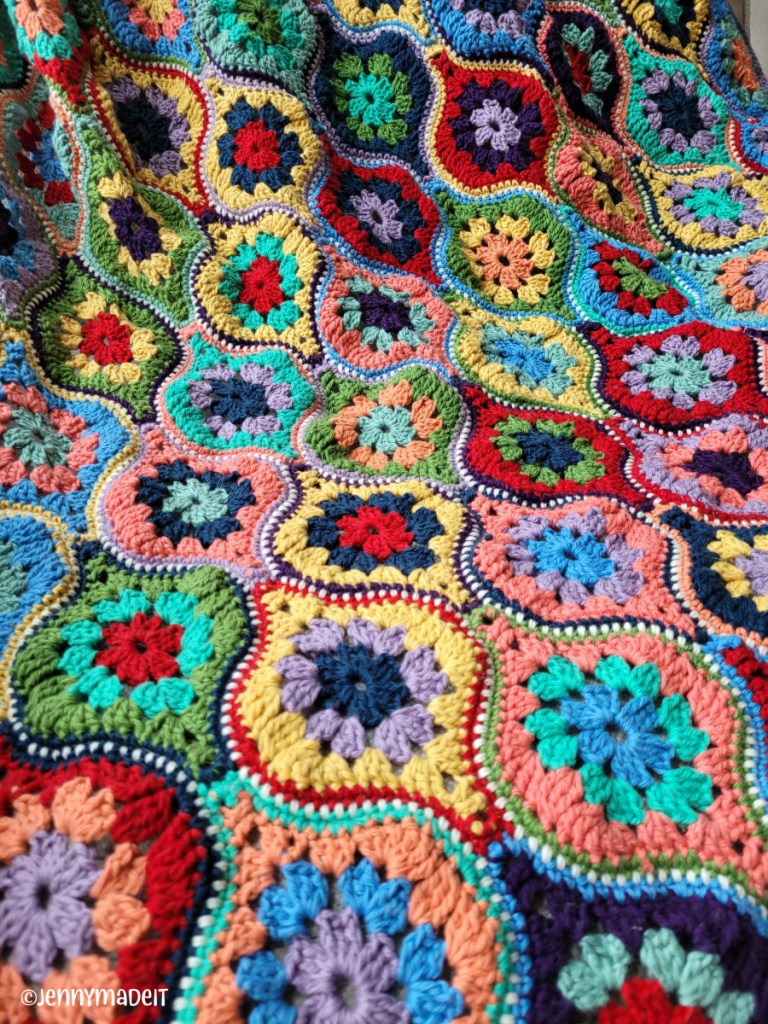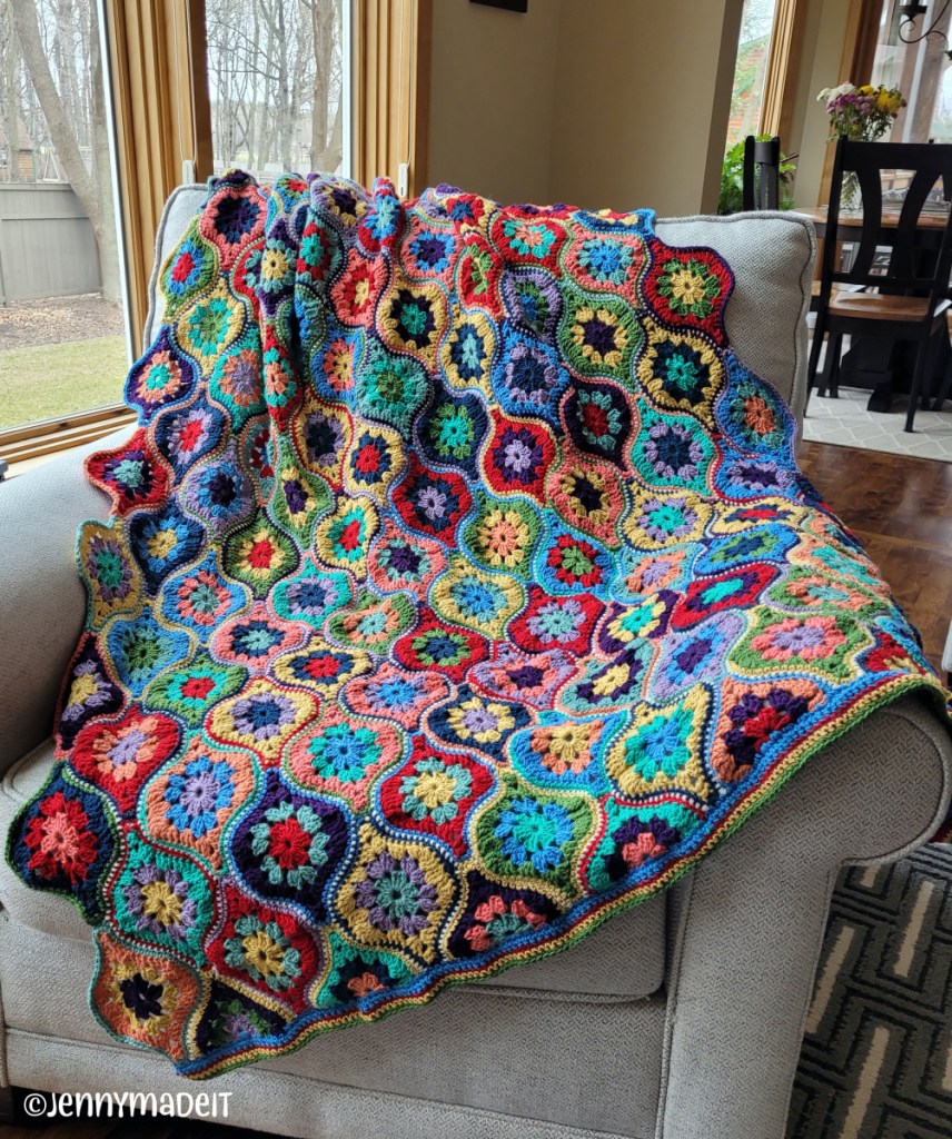 I have recently finished two crochet projects, a blanket and a cardigan. The blanket was started over a year ago, set aside, worked on, set aside…you get the gist, right? It was a large project, with so many colors and so much weaving in of the ends. I finally picked it up again a few days ago and worked hard to get it finished. It is called Mystical Lanterns by Janie Crowfoot. Here is a link to her site, where you can purchase the pattern. Or you can also find it on Ravelry here. I loved this blanket when I saw photos of it and knew I had to make it. I purchased CotLin DK weight yarn from Knit Picks for my blanket. I also picked up a few stray skeins of StyleCraft yarn in DK. I wanted to try StyleCraft because one of my crochet heroes, Susan Pinner, uses it a lot. I believe I found mine on eBay. The CotLin yarn is a cotton and linen blend. I really liked working with it better than kitchen cotton yarn. It’s a bit easier on the hands.