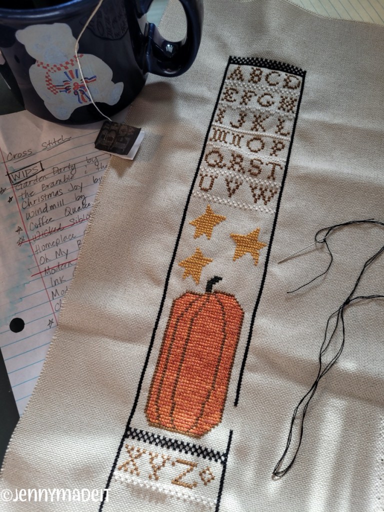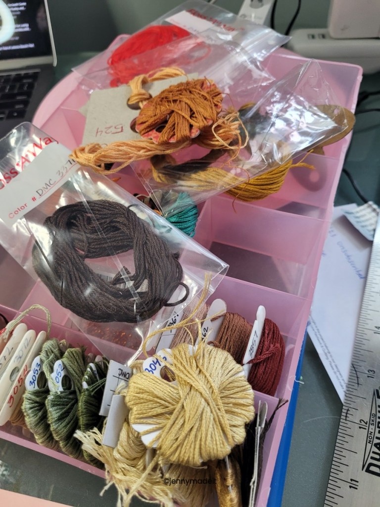 Or should I say, I’m frugal, and somewhat thrifty. When I’m working on a stitching project, my main goal is to get the piece stitched as neatly as possible, even though I have let go of trying to be a perfectionist about it. I also like to focus on making sure the right floss is with the right project and that the floss doesn’t turn into a bird’s nest while in a project bag. Years ago, in the early 90’s, I was dating my now husband and we were at a local mall where I purchased a cross stitch pattern called Teddy Bear Reunion. It had over 50 colors of embroidery floss in the pattern, and I purchased all those DMC colors. Then I enlisted my future husband’s help to “bobbinate” all those flosses onto those little white cardboard pieces and stick them in a plastic box. I would pull out the color of floss I needed as I was stitching the many teddy bears.