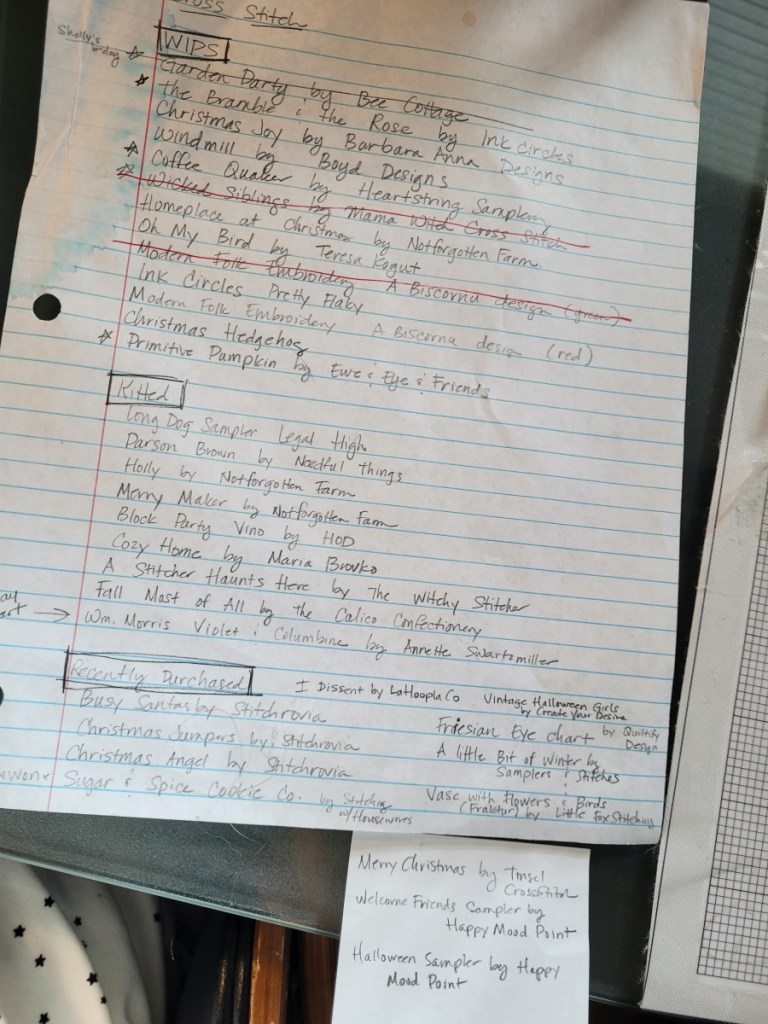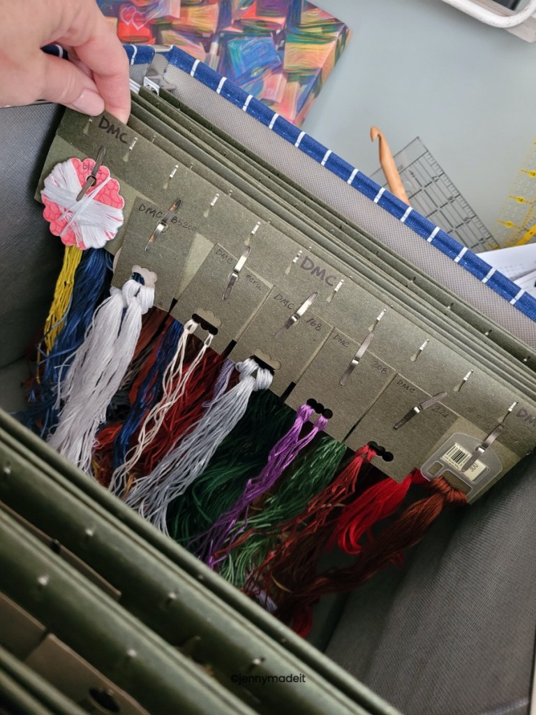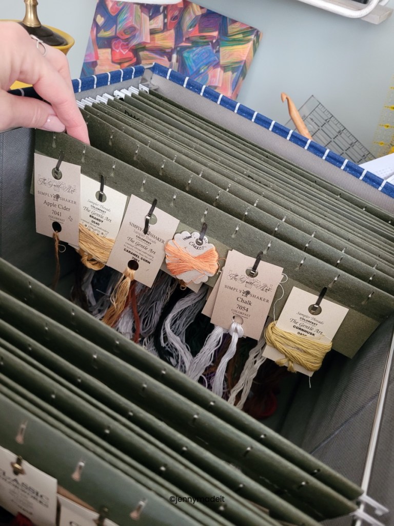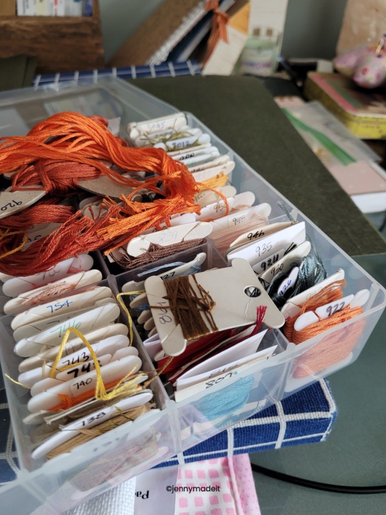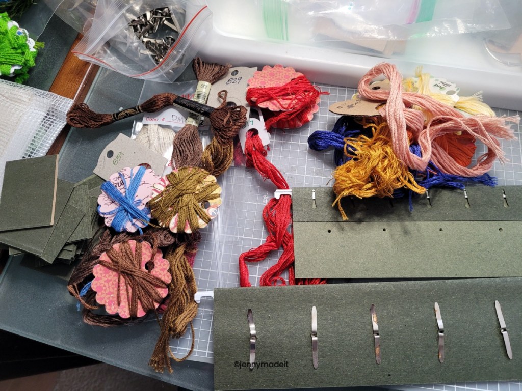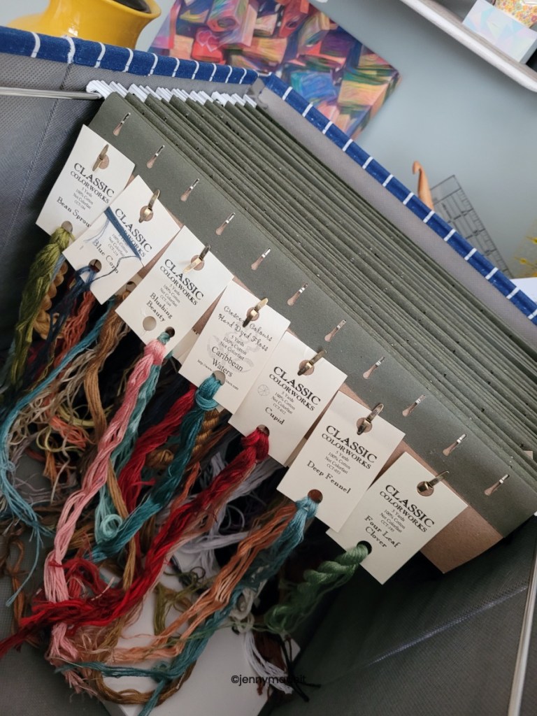 So, in 2023, I decided that I needed to get my flosses better organized. I still had the plastic box from the 90’s! I still had flosses my husband wrapped up on bobbins way back when. It’s easy to recognize his printing. I don’t have that much in the way of a floss collection because I have never gotten into any silks (yet) and I have only used DMC, Classic Colorworks overdyed flosses as well as The Gentle Arts overdyed flosses and Weeks Dye Works flosses. I also have literally 4 or 5 spools of Anchor floss. I tried to make my own cute floss drops with scrapbook paper glued onto stiff cardboard then die cut with my Sizzix machine, but this was tedious and not worth my time. So then I would just die cut plain old paperboard, or chip board. After I finished a project, I would just throw all the overdyed flosses into a small bin. After all, I didn’t have a lot.